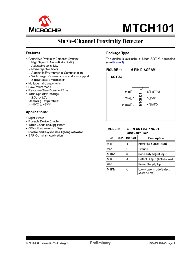 MTCH101 Single-Channel Proximity Detector Data Sheet (07/22/2013)