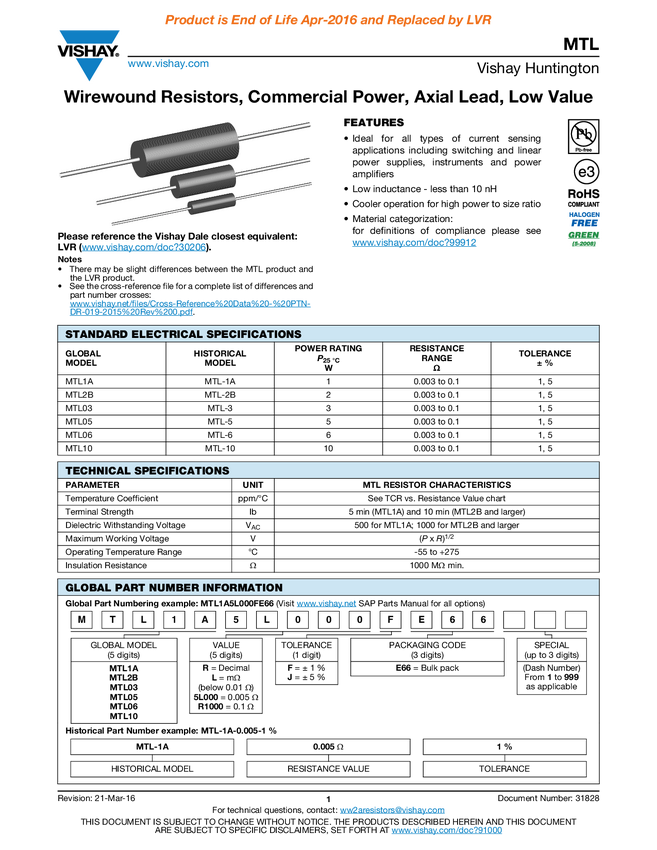 Wirewound Resistors, Commercial Power, Axial Lead, Low Value