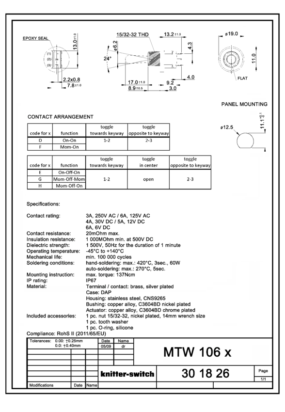 Switch Toggle ON OFF ON SPDT Round Lever Solder Lug 6A 250VAC 30VDC Panel Mount with Threads