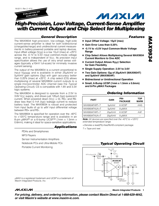 MAX9934 High-Precision, Low-Voltage, Current-Sense Amplifier with Current Output and Chip Select for Multiplexing