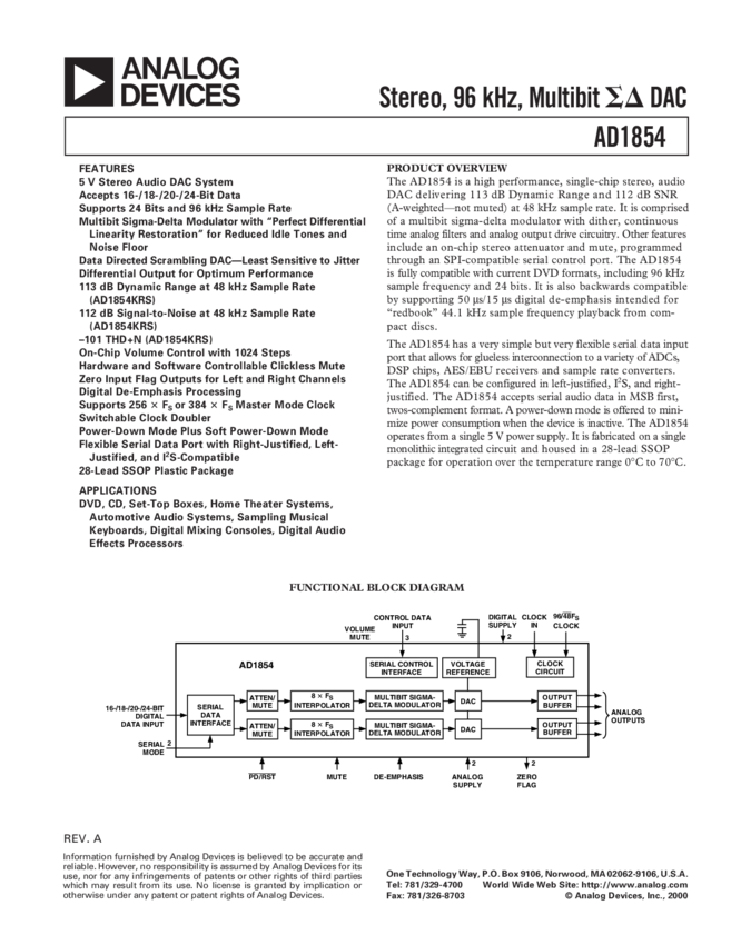 Stereo, 24-Bit, 192 kHz, Multibit Sigma Delta DAC