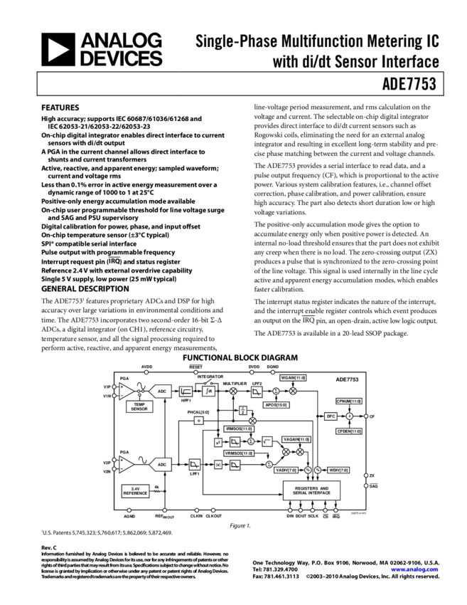 ADE7953: Single Phase Multifunction Metering IC with Neutral Current Measurement