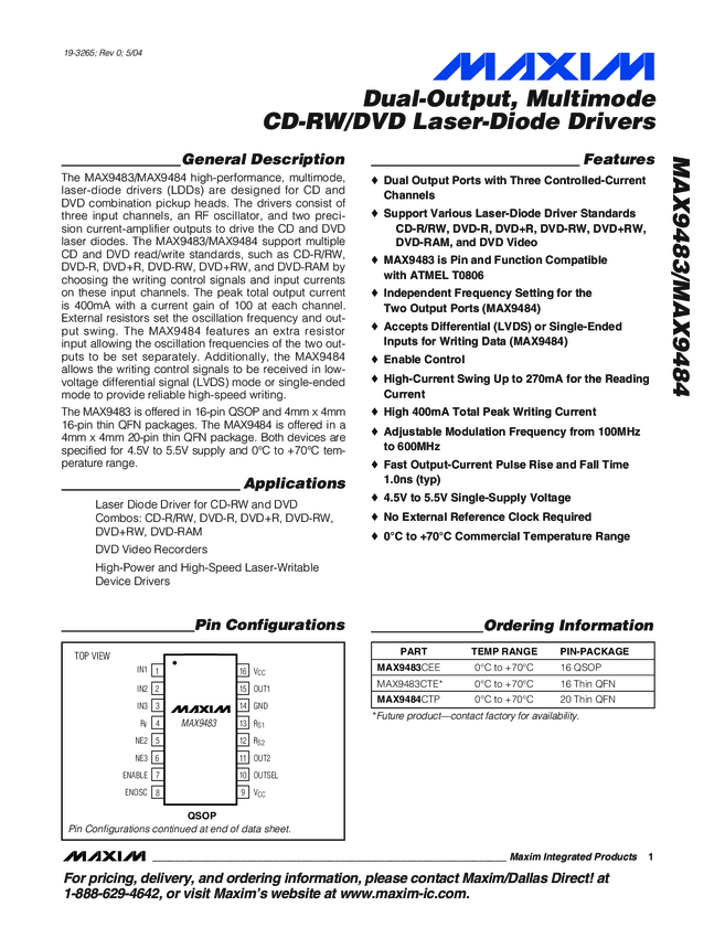 Dual-Output, Multimode CD-RW/DVD Laser-Diode Drivers