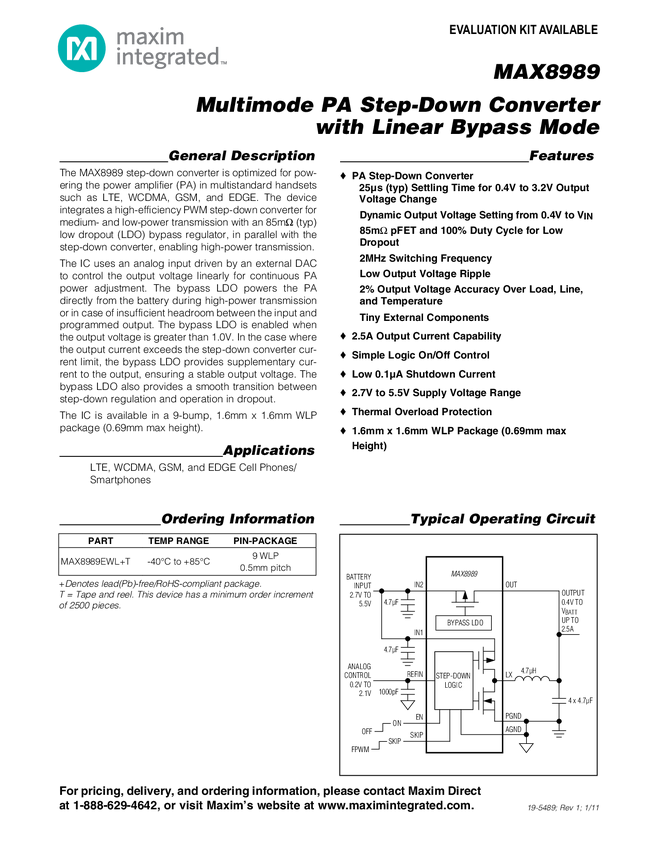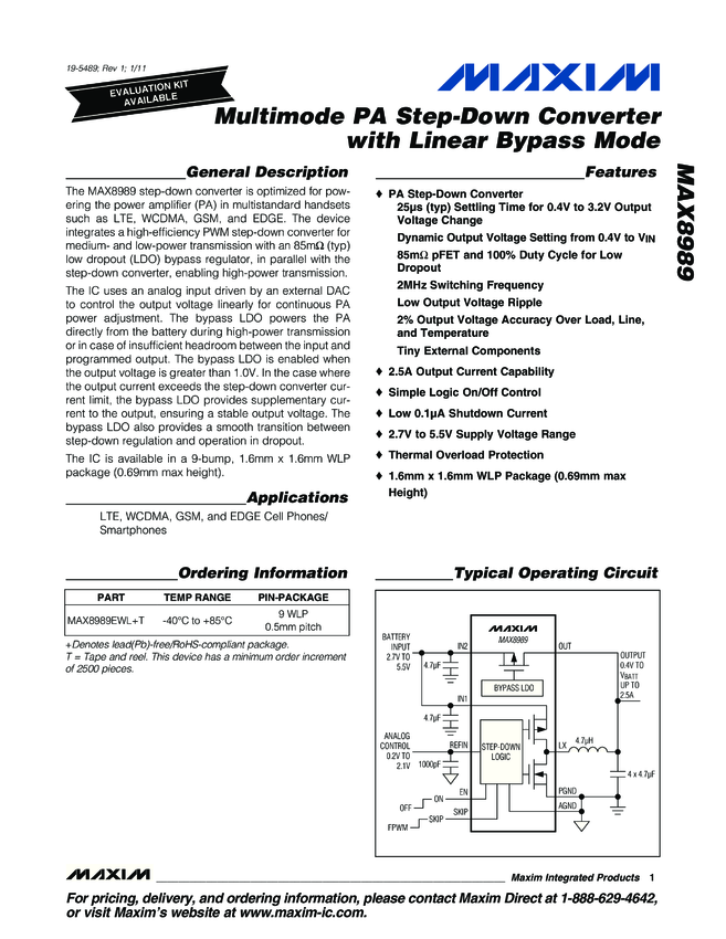 MAX8989 Multimode PA Step-Down Converter with Linear Bypass Mode