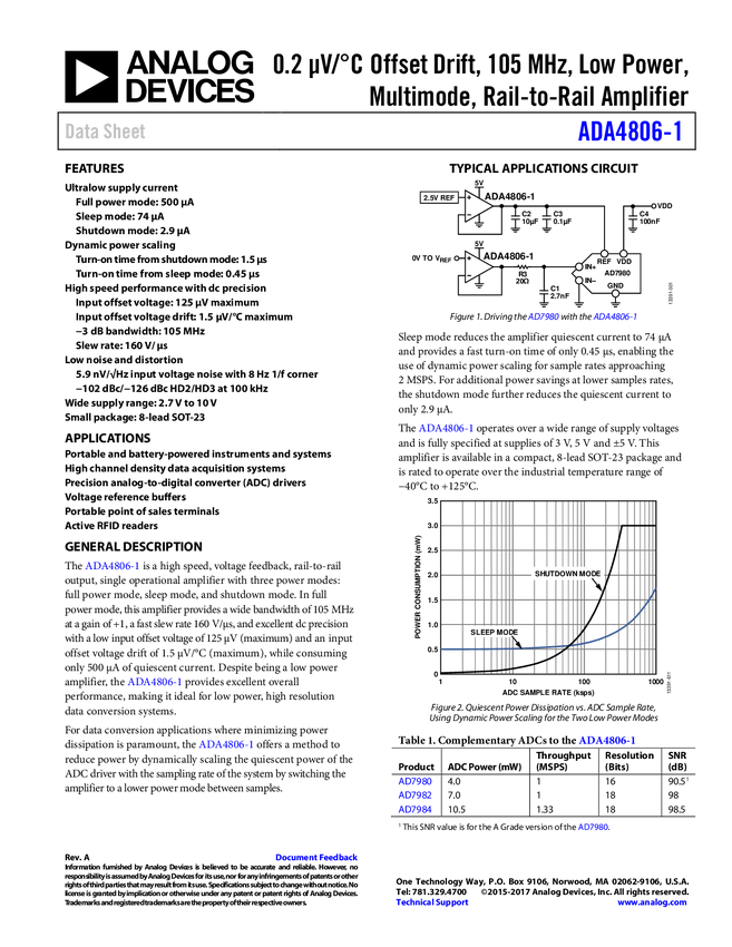 0.2 μV/°C Offset Drift, 105 MHz, Low Power, Multimode, Rail-to-Rail Amplifier