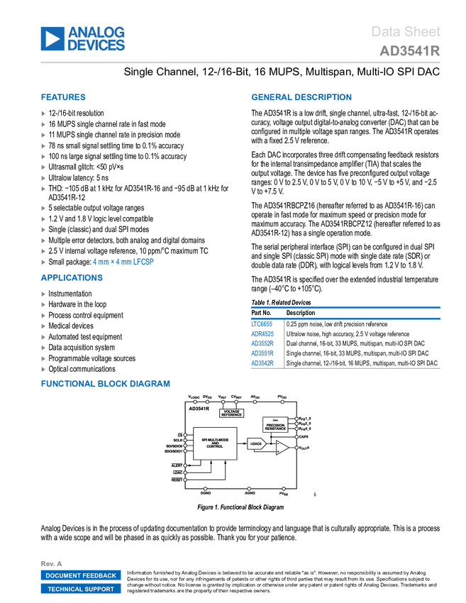 Single Channel, 12-/16-Bit, 16 MUPS, Multispan, Multi-IO SPI DAC