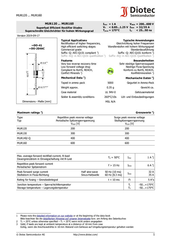 Dioda prostownicza Diotec MUR120 N/A N/A