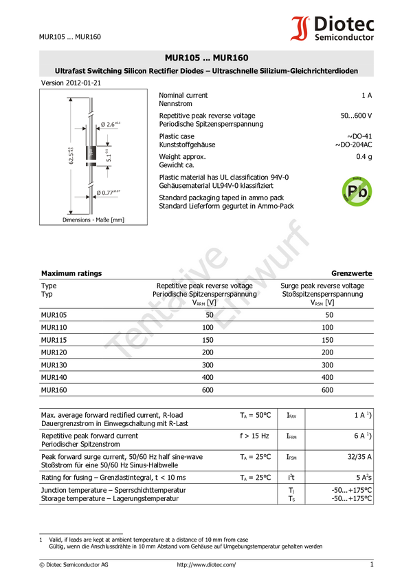 Dioda MUR140 DO-41 Diotec MUR140.