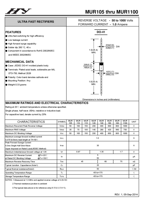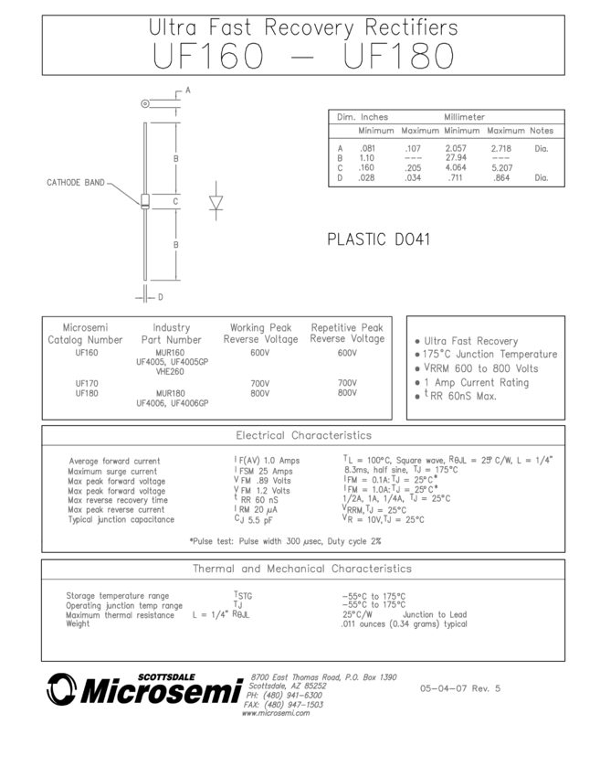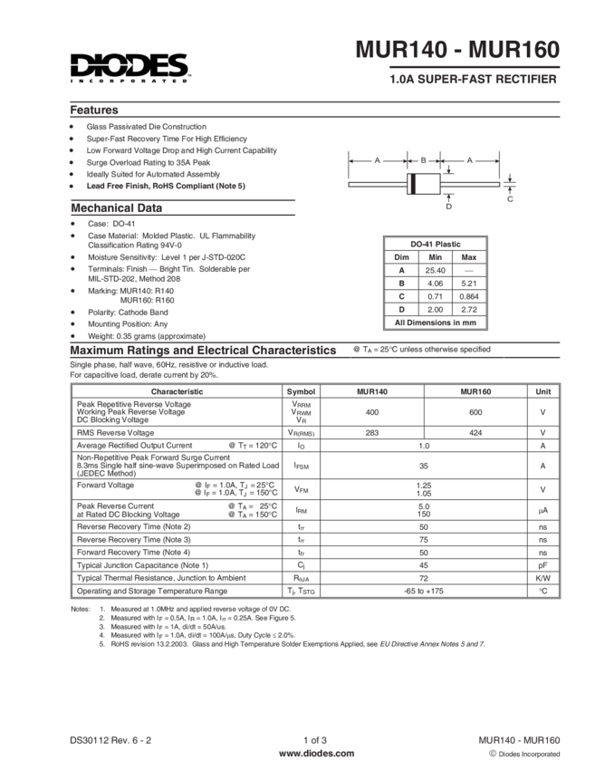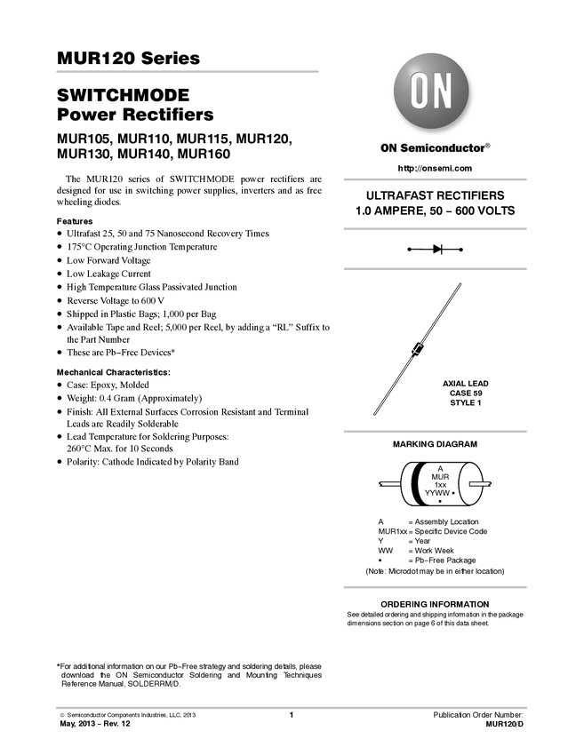 Power Rectifier, Ultra-Fast Recovery, Switch-mode, 1 A, 600 V