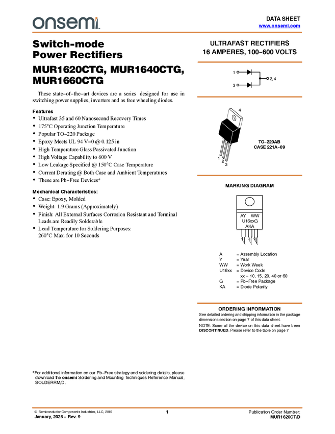 Power Rectifier, Ultra-Fast Recovery, Switch-mode, 16 A, 600 V