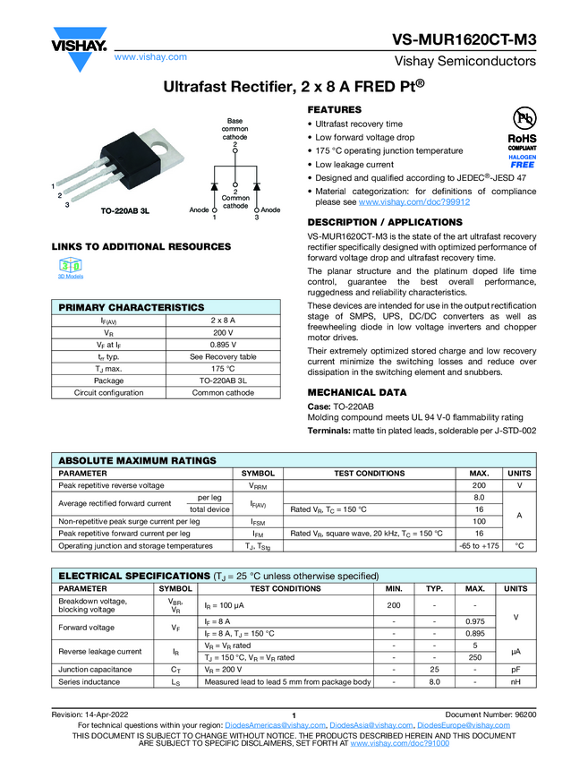 Power Rectifier, Ultra-Fast Recovery, Common Anode, 16 A, 200 V