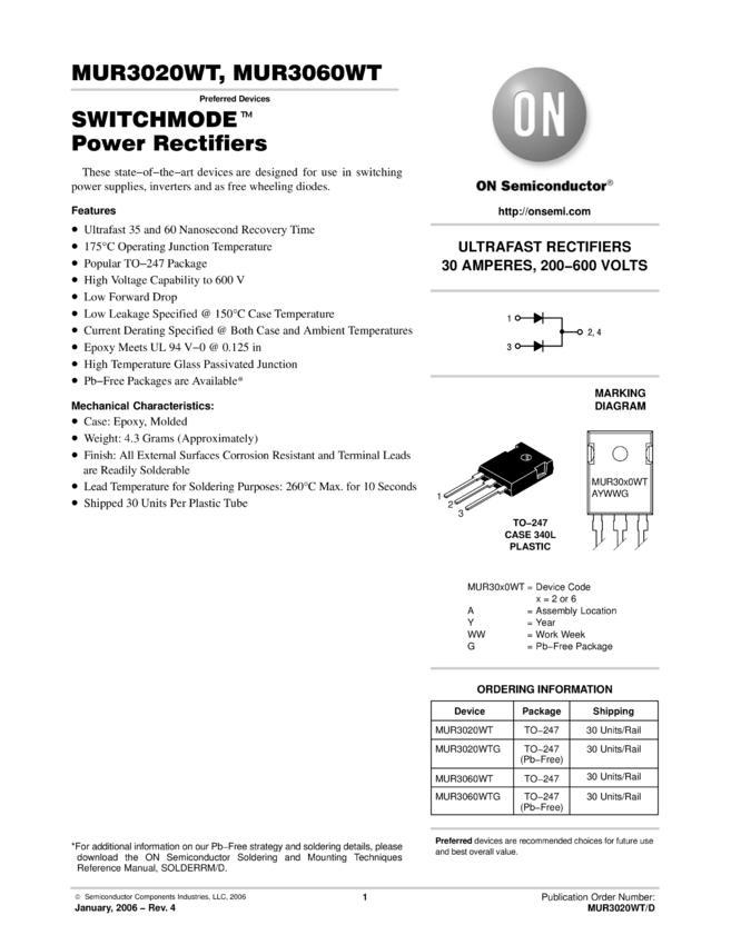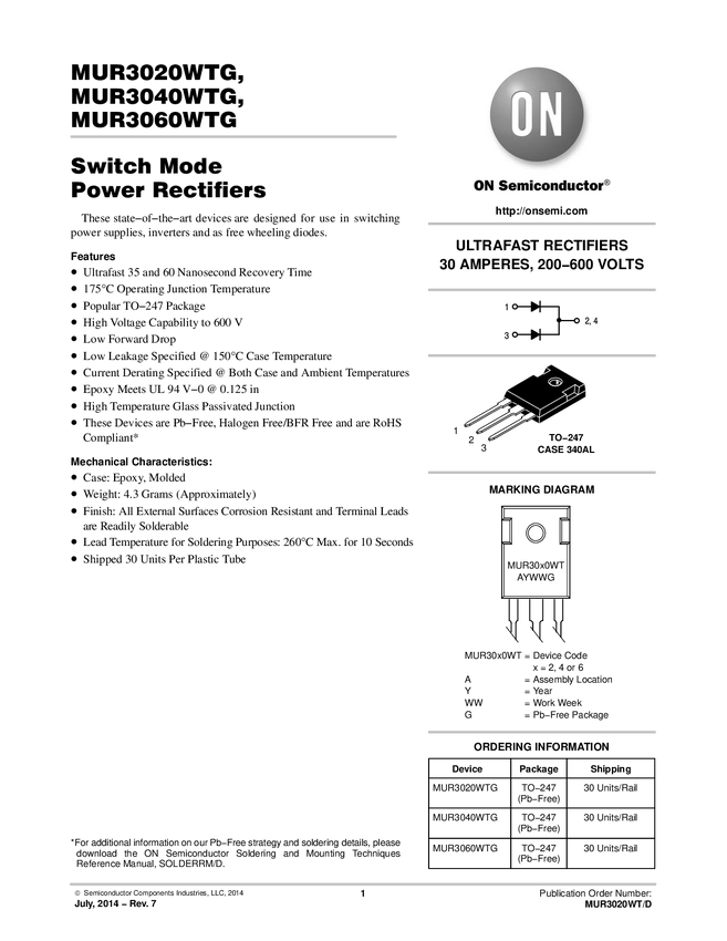 Power Rectifier, Ultra-Fast Recovery, Switch-mode, 30 A, 600 V