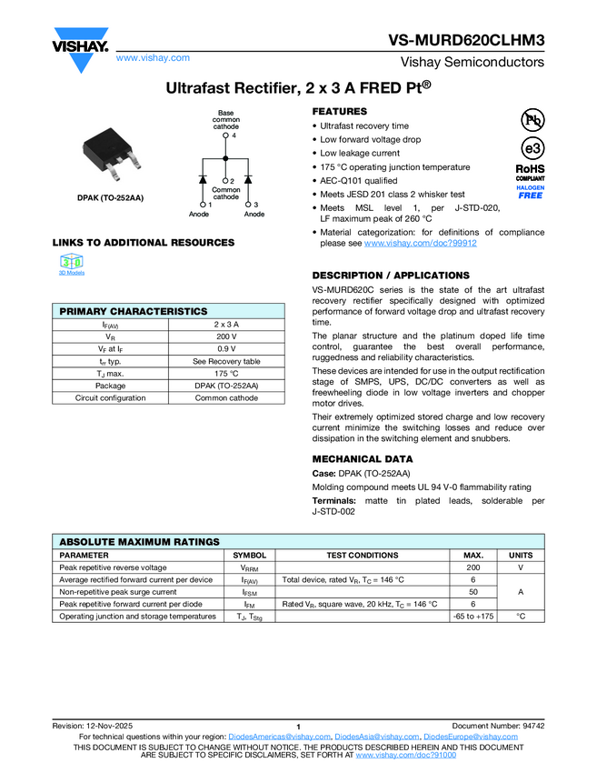 Ultrafast Rectifier, 2 x 3 A FRED Pt®
