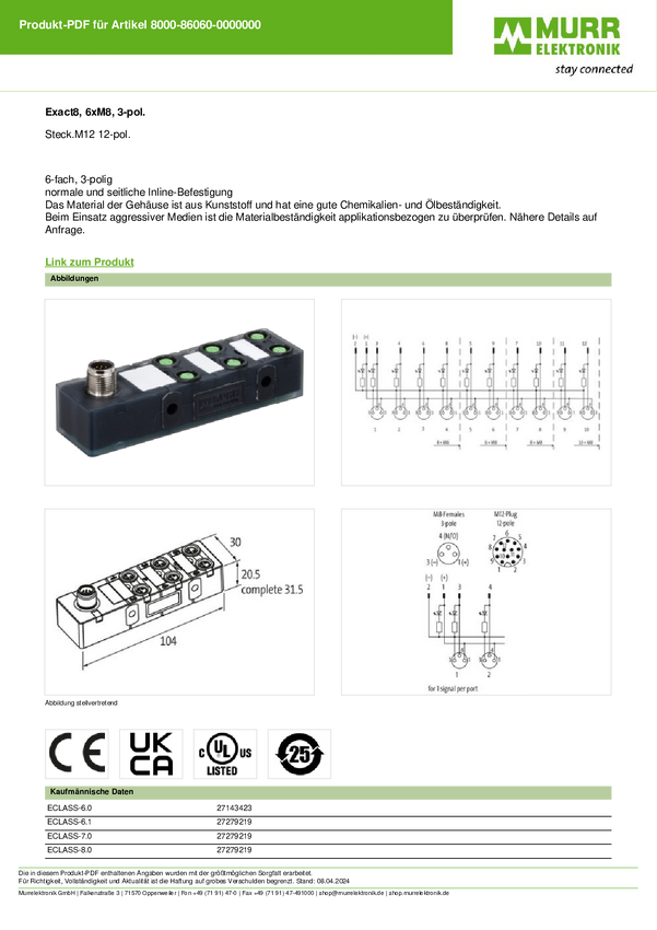 Rozdzielacz czujnik / element wykonawczy, pasywny Murrelektronik 8000-86060-0000000 1 szt.