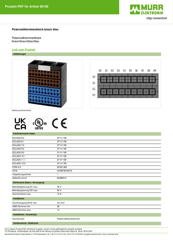 Listwa zaciskowa potencjału Murrelektronik 56082 56082, 1 szt.