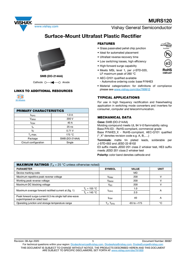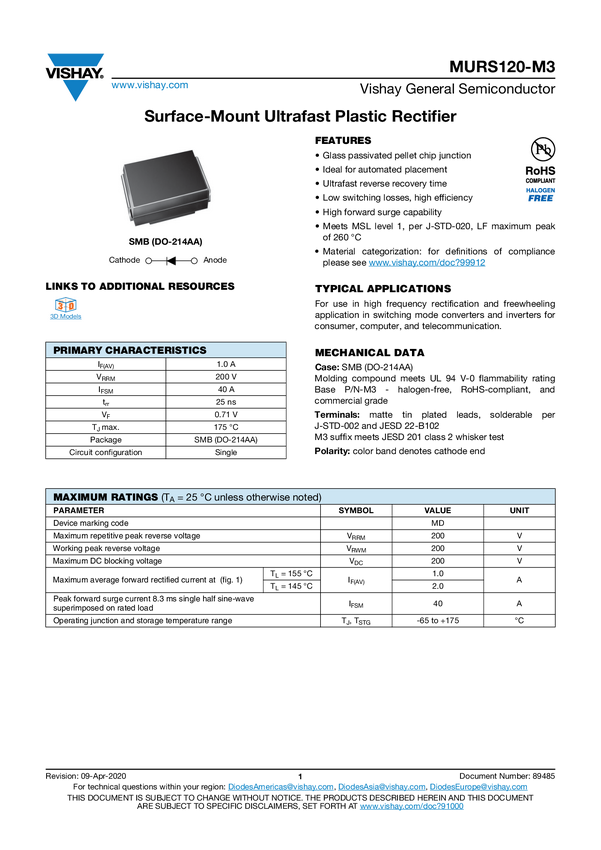 Dioda standardowa Vishay MURS120-E3/52T N/A N/A