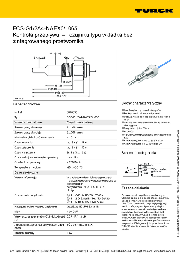 Turck 6870339 Czujnik zanurzeniowy FCS-G1/2A4-NAEX0/L065/D024, 1 szt.