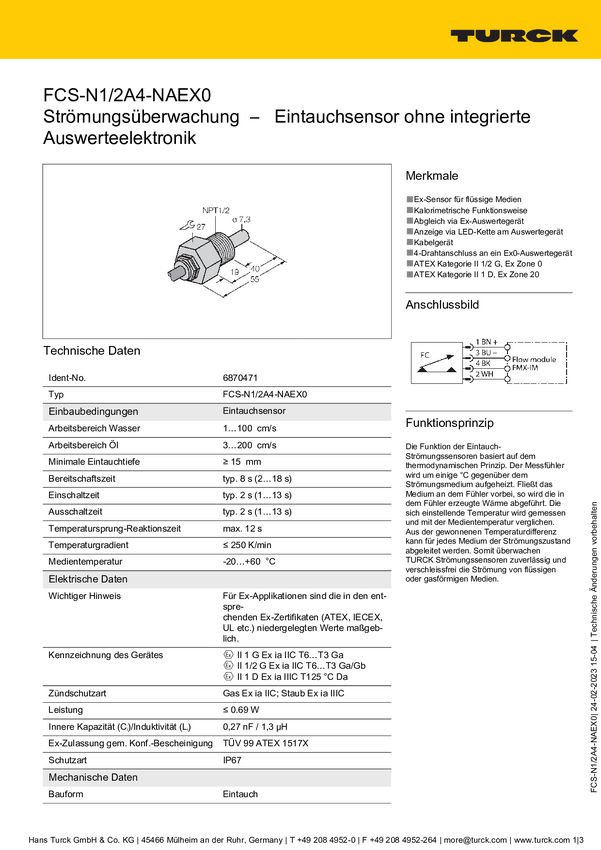 Turck 6870472 Czujnik zanurzeniowy FCS-N1/2A4-NAEX0-H1141, 1 szt.