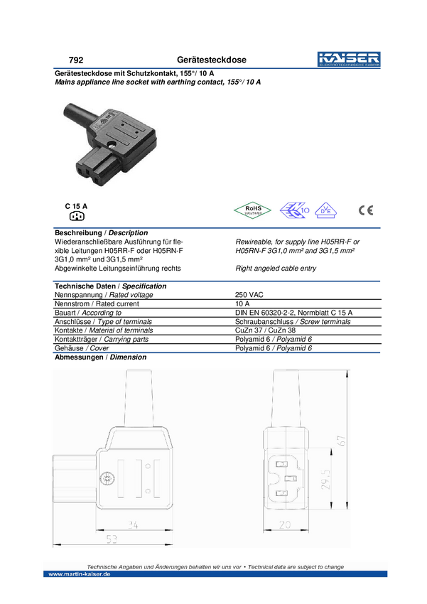 Złącze męskie do nagrzewających się urządzeń Martin Kaiser C15A złącze żeńskie kątowe Łączna ilość styków: 2 + PE 10 A c