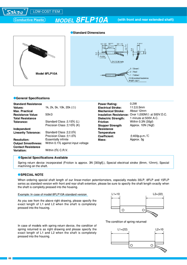 Potencjometr liniowy przewodzący plastyk ze sprężyną powrotn ą; pomiar 10mm; wym.:7,3x8,2x32mm; lin 2%; moc 0,2W; kabelki ; ośka z dwóch stron; z jednej nagwintowana M2 L1=8mm; IP40; trwałość 20 mil cykli; Rezystancja 1 kohm