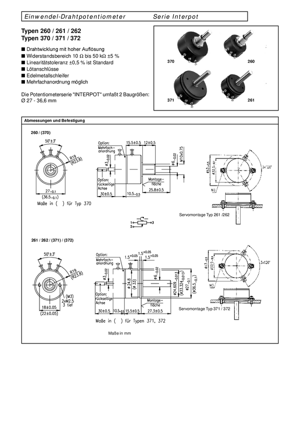 Potencjometr drutowy; servo; lin0,5%; 1 obrotowy; średnica 36,5mm; gł. 15,5; ośka 6 mm x 27,3 mm; moc 3W; trwałość 3 mi liony cykli; rezystancja 47 ohm; 2 nagwintowane otwory M3 rozstaw 22mm;=pm372+łóżyskowany kulkowo; odpowiednik FCP40A.