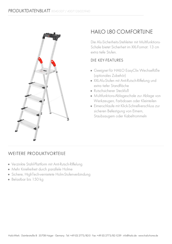 Hailo L80 ComfortLine 8040-807 aluminium Drabina składana ze stopniem zaw. wkładkę na narzędzia Maksymalna wysokość robo