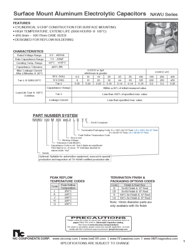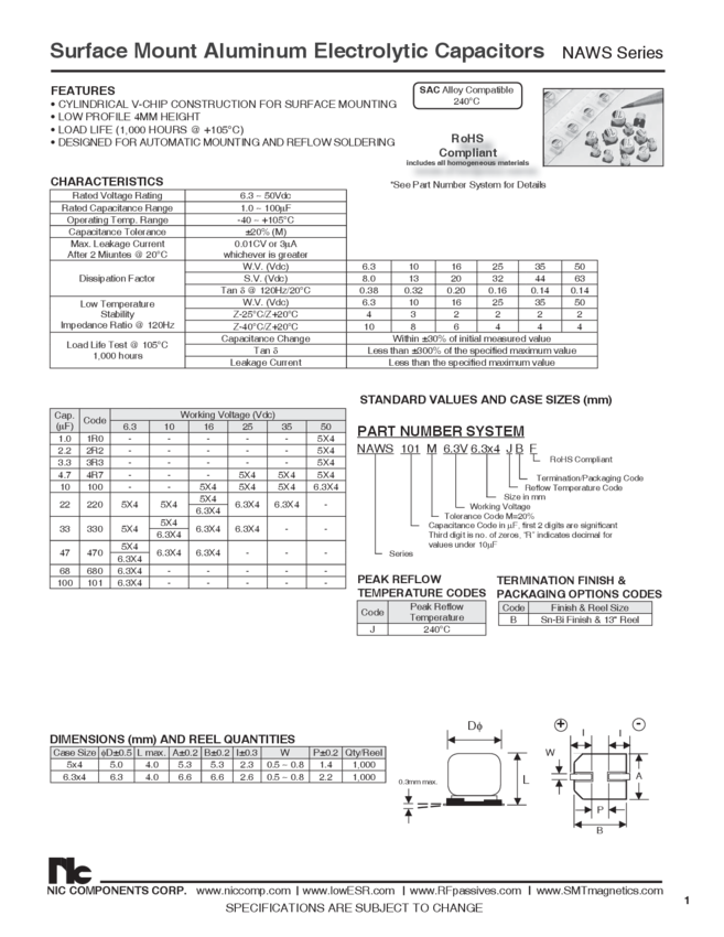 Cap Aluminum 47uF 16V 20% (6.3 X 4mm) Cylindrical 38mA 1000 hr 105°C T/R