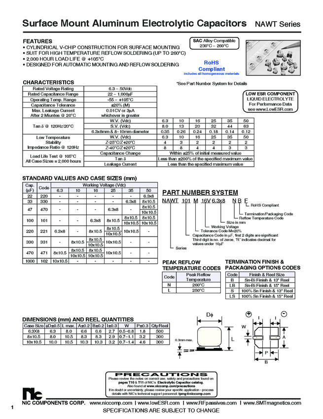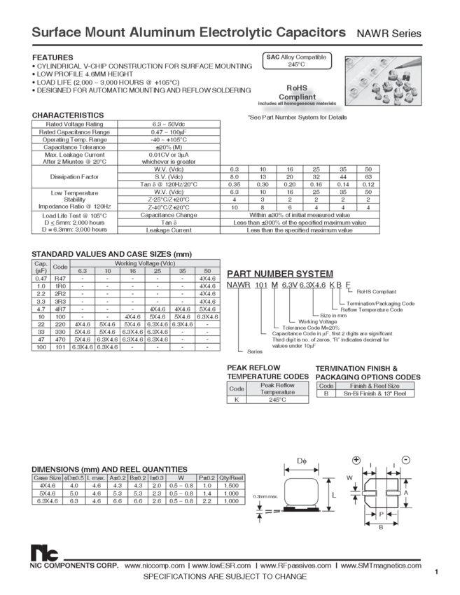 Cap Aluminum 47uF 25V 20% (6.3 X 4.6mm) Cylindrical 44mA 3000 hr 105°C T/R