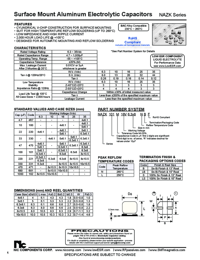 Cap Aluminum 100uF 25V 20% (6.3 X 8mm) Cylindrical 600mA 2000 hr 105°C T/R