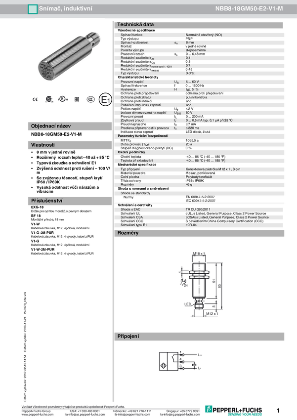 Pepperl+Fuchs Czujnik indukcyjny PNP NBB8-18GM50-E2-V1-M