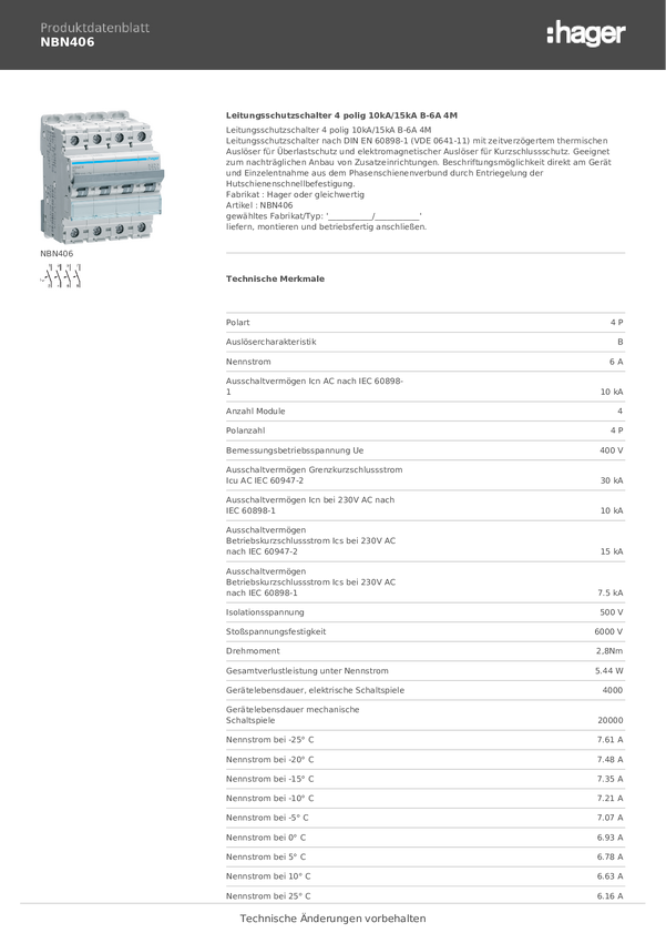 Hager NBN406 Wyłącznik automatyczny 4 styki 6 A 400 V