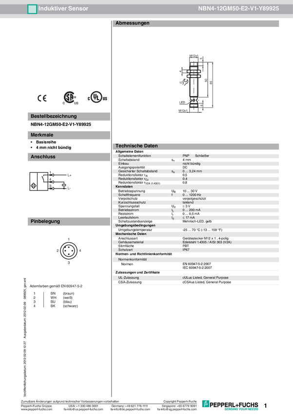 Pepperl+Fuchs Czujnik indukcyjny nie podtynkowy PNP NBN4-12GM50-E2-V1-Y89925
