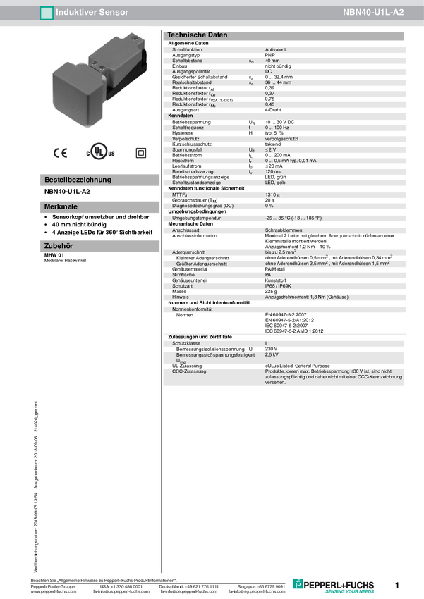 Pepperl+Fuchs Czujnik indukcyjny nie podtynkowy PNP NBN40-U1L-A2