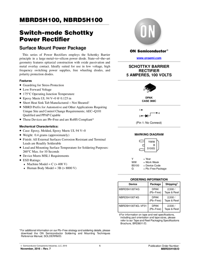 Schottky Power Rectifier, Switch-mode, 5.0 A, 100 V