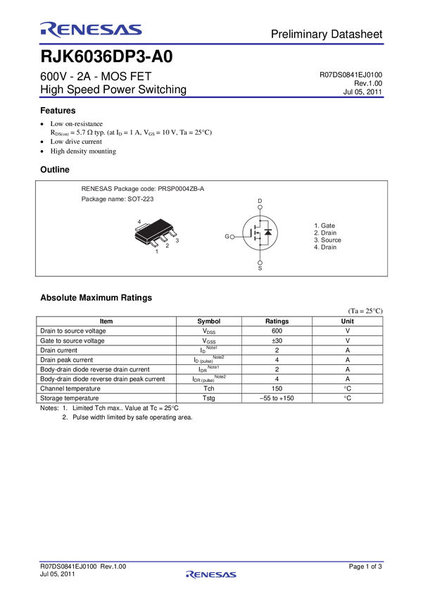 Nch Single Power Mosfet 600V 2A 6800Mohm Sot-223