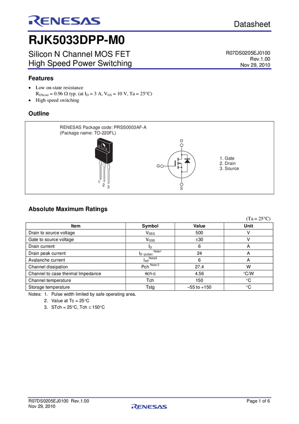 Nch Single Power Mosfet 600V 6A 1370Mohm To-220Fp