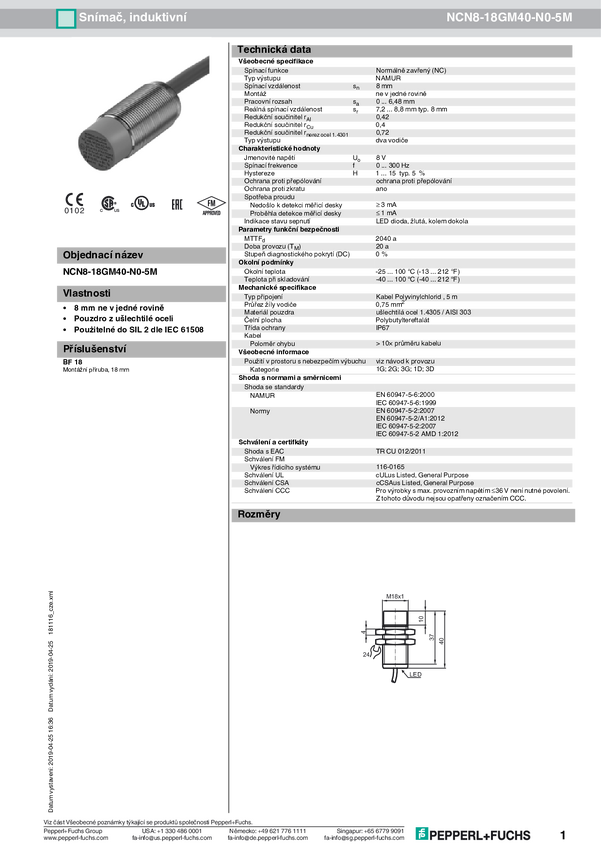 Czujnik indukcyjny Pepperl+Fuchs NCN8-18GM40-N0 123G1x3D 70133267 1 szt.