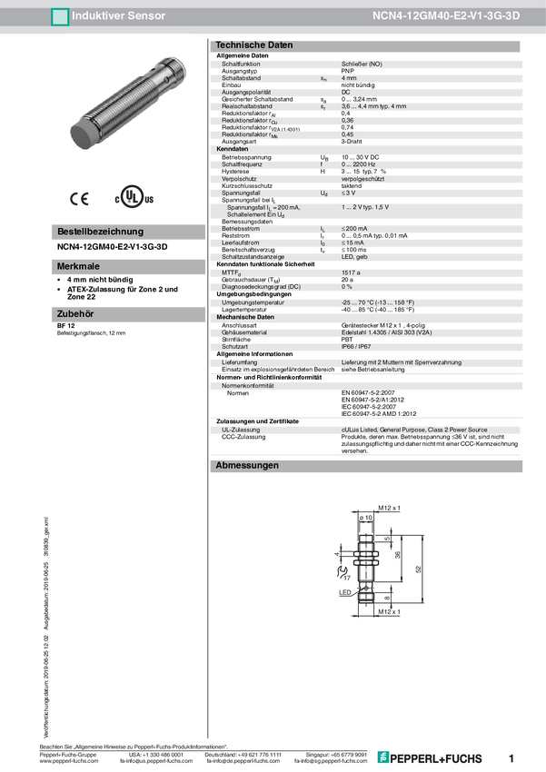 Czujnik indukcyjny Pepperl+Fuchs NCN4-V3-N0 12xG1xxD 70133087 1 szt.