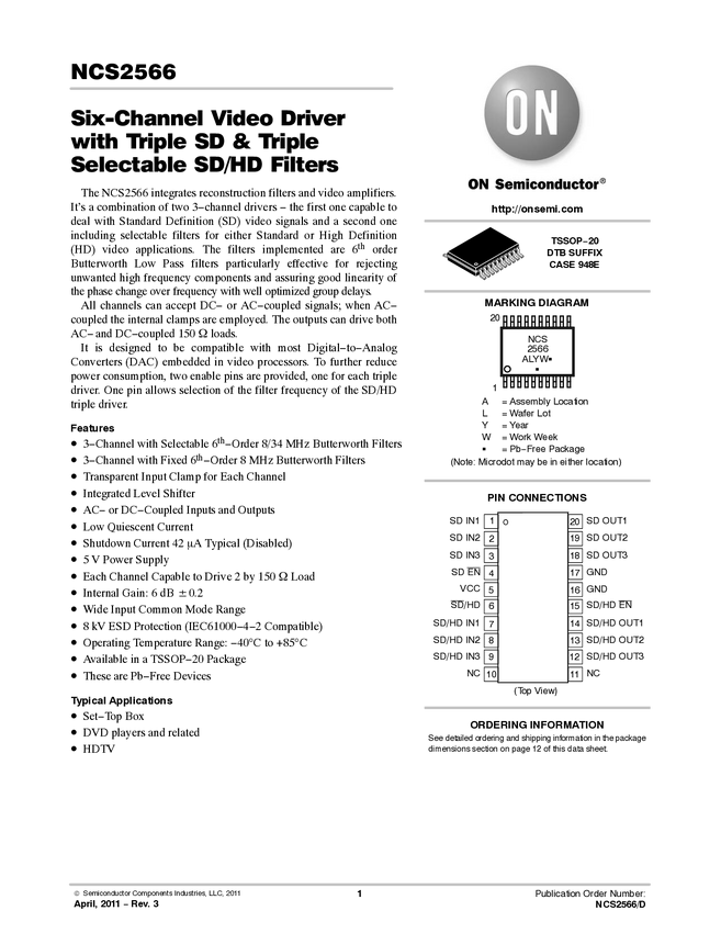Video Amplifier, 3-Channel, with Standard Definition Reconstruction Filters