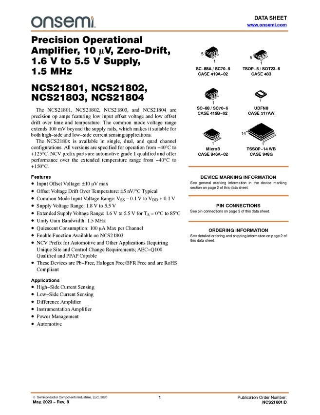 Precision Operational Amplifier, 10µV, Zero-Drift, 1.8V to 5.5V Supply, 1.5 MHz