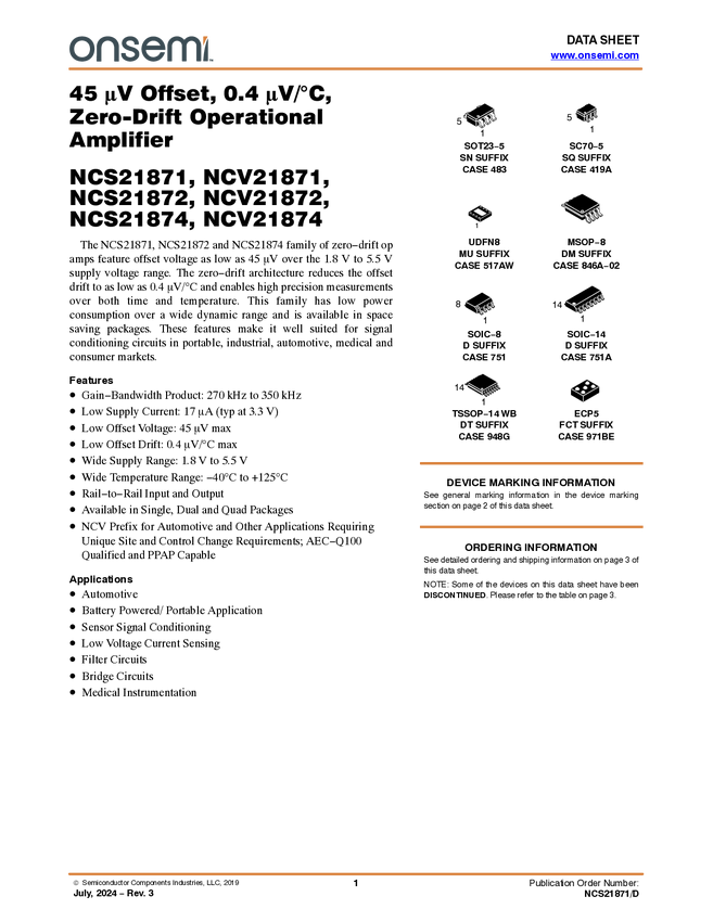 Operational Amplifier, 50 µV Offset, 0.25 µV/C, 35 µA, Zero-Drift