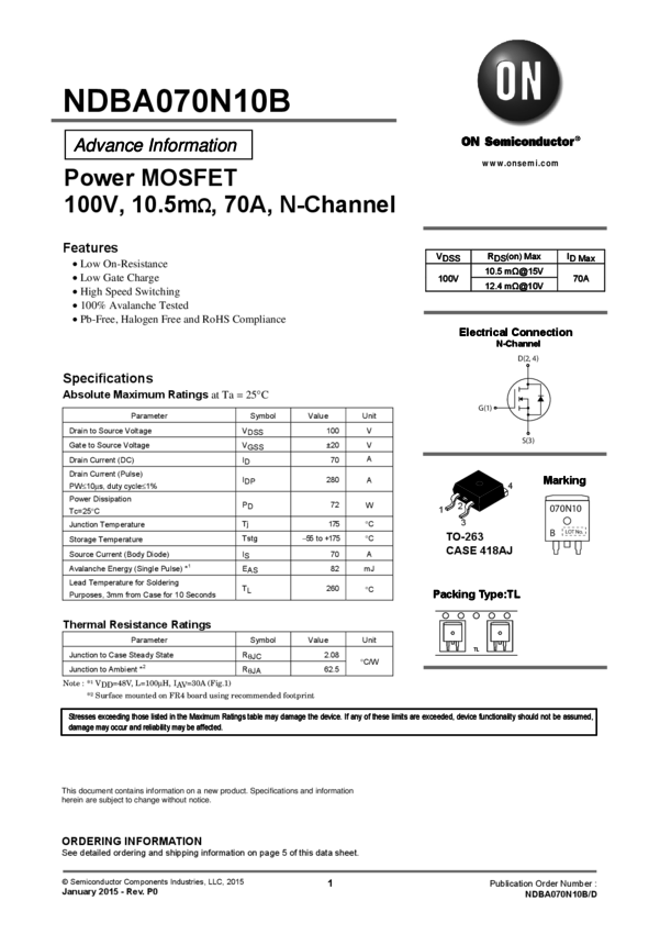 Power MOSFET, 100V, 10.5mΩ, 70A, N-Channel