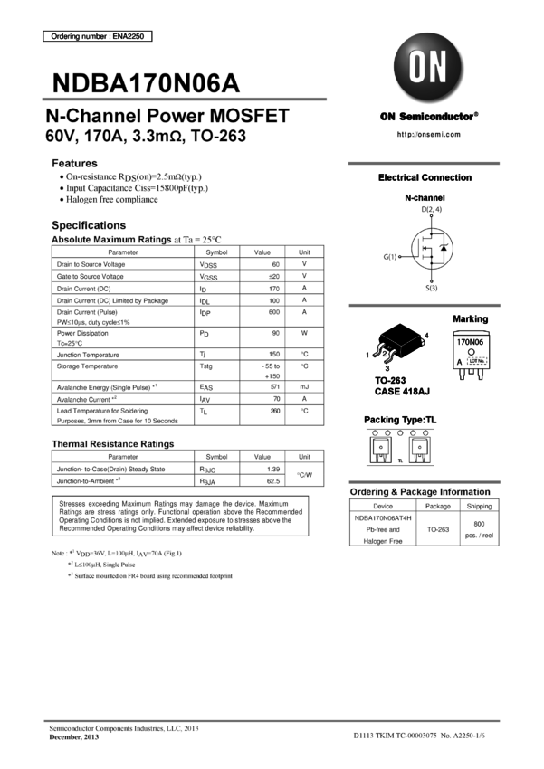 N-Channel Power MOSFET, 60V, 170A, 3.3mΩ, TO-263