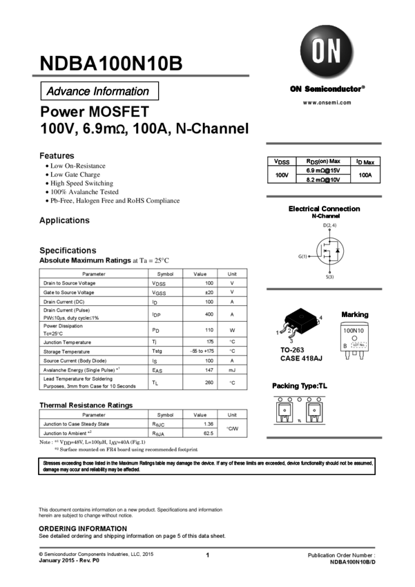 Power MOSFET, 100V, 6.9mΩ, 100A, N-Channel
