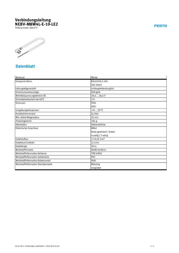 FESTO 562473 Kabel połączeniowy czujnika/aktuatora NEBV-M8W4L-E-10-LE2, piny: 4, 10.00 m, 1 szt.