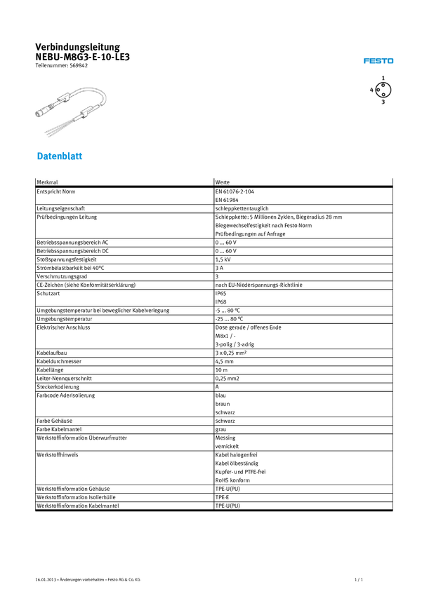 FESTO 569842 Kabel połączeniowy czujnika/aktuatora NEBU-M8G3-E-10-LE3, piny: 3, 10.00 m, 1 szt.