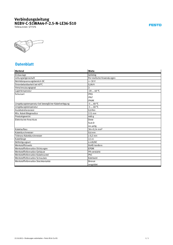 FESTO 577376 Kabel połączeniowy czujnika/aktuatora NEBV-C-S7WA44HS-K-2.5-N-LE36-S10, piny: 44, 36, 2.50 m, 1 szt.