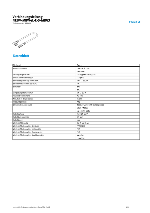 FESTO 562469 Kabel połączeniowy czujnika/aktuatora NEBV-M8W4L-E-5-M8G3, piny: 4, 3, 5.00 m, 1 szt.
