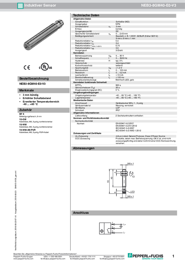Pepperl+Fuchs Czujnik indukcyjny podtynkowy PNP NEB3-8GM40-E2-V3