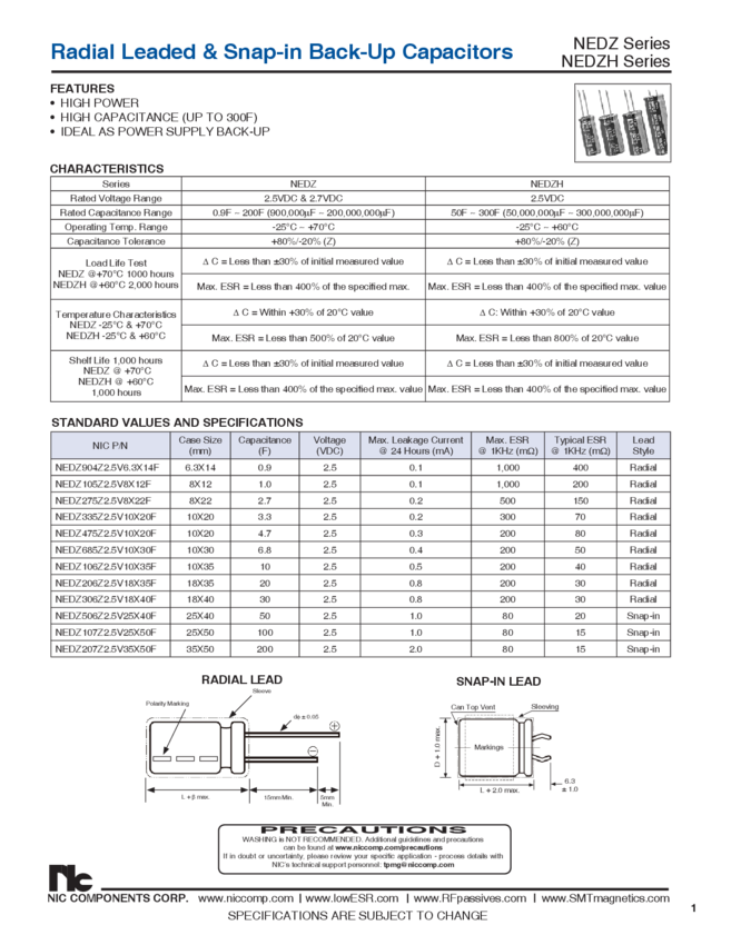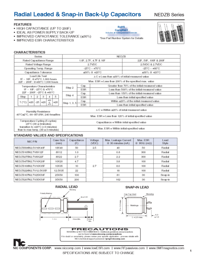 Cap 20F 2.7V -20% to 80% 1000 hr (18 X 35mm) Radial 7.5mm 70°C Bulk